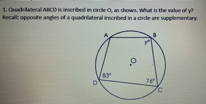 Conversely, if m∠a+m∠c=180° and m∠b+m∠d=180°, then abcd is inscribed in ⨀e. An inscribed angle is the angle formed by two chords having a common endpoint. If a quadrilateral (as in the figure above) is inscribed in a circle, then its opposite angles are supplementary Angles in inscribed quadrilaterals i. An inscribed quadrilateral or cyclic quadrilateral is one where all the four vertices of the quadrilateral lie on the circle.